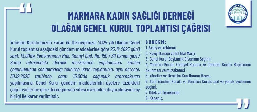 Marmara Kadın Sağlığı Derneği olarak Marmara Bölgesinde çalışan kadın hastalıkları ve doğum uzmanı hekimlerimizin meslek örgütü olarak faaliyete geçiyoruz.